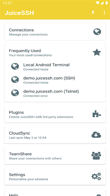 JuiceSSH界面非常简洁,板块分区明确,且对于从业人士来说上手并不难。它提供了有效的移动端解决方案,让你的开发、管理更加便捷。